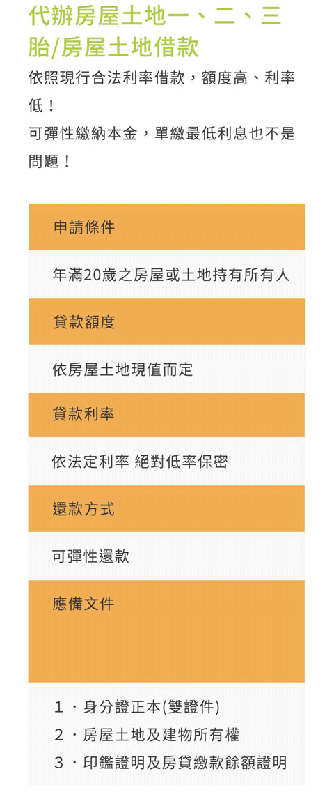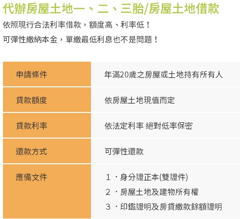 產品特色針對目前尚在別家當鋪借款的客戶,提出更優惠的利率,更高的額度方案。申請條件年滿20歲之國民,免聯徵,免收入證明,職業不限八大行業......2019-10-14